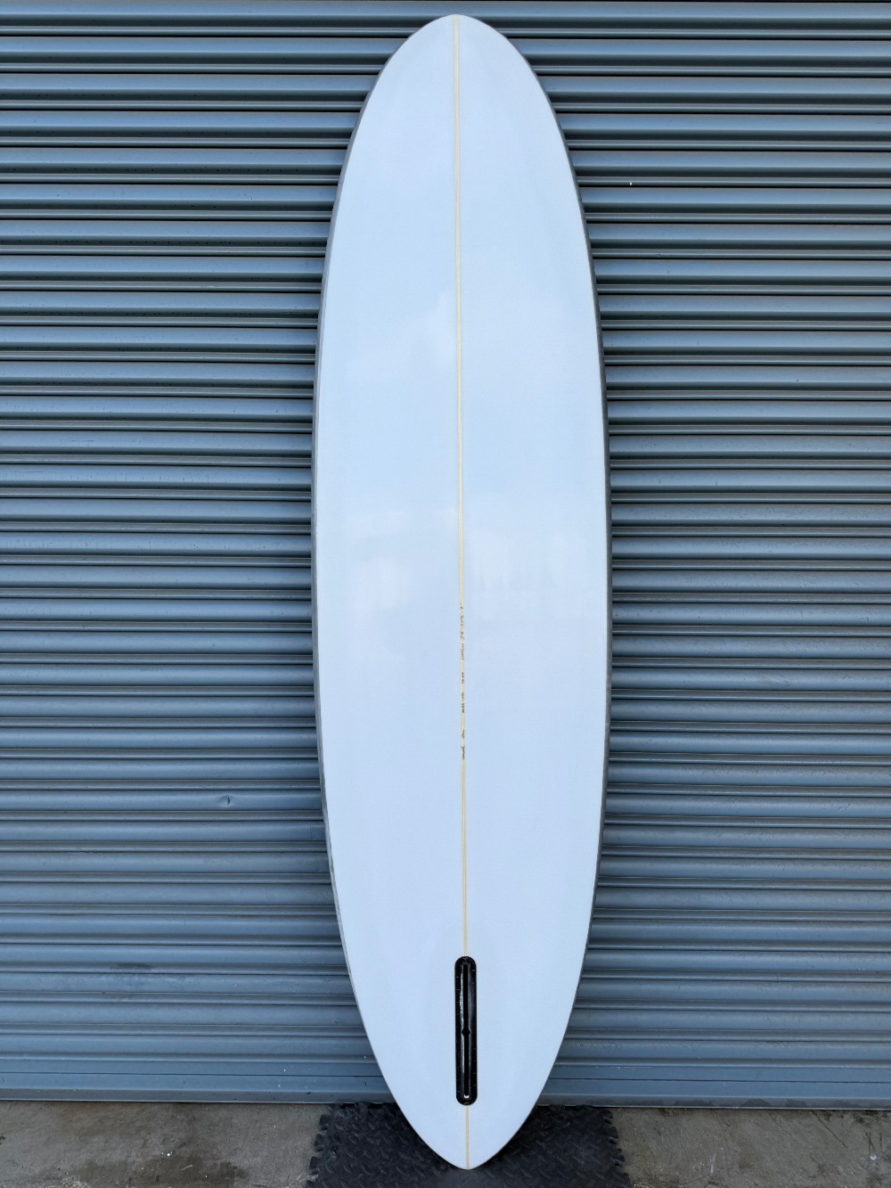 7’6” x 22 1/2” x 3” Poly Single fin Round tail